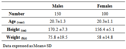 Subjects consisted of 150 male and 100 female healthy, adult students of the age range 17-23 years. Participants (randomly chosen from the University of Tabuk in Saudi Arabia) were nonsmokers and were free from any acute or chronic conditions that could affect the validity of the tests. All subjects gave their informed consent after explanation of all the test procedures. The study was approved by the Research Committee of the University of Tabuk. Data were obtained for each subject regarding age, sex, height, and weight.