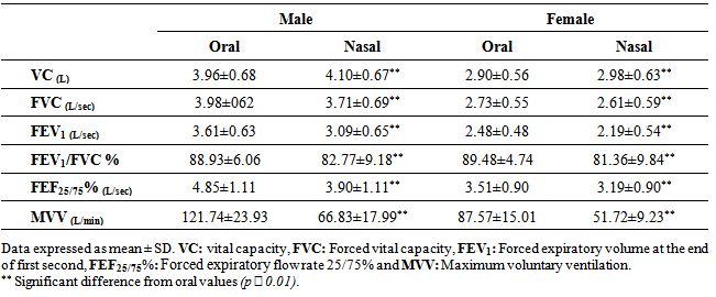 Table 2. Parameters of spirometry measured via oral and nasal routes in male and female subjects  |