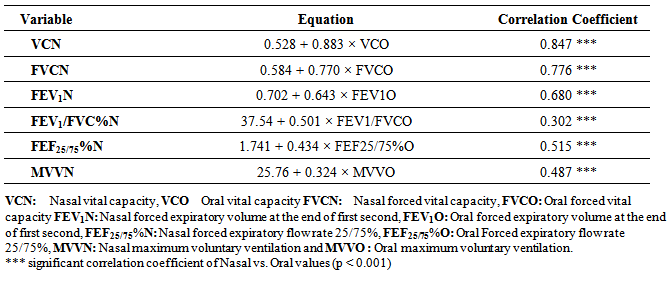 The results of VC, FVC, and FEV1, FEV1/FVC%, FEF25/75% and MVV measured by oral and nasal spirometry were compared using paired t-test with a significance level of p < 0.05. For generating prediction equations for nasal spirometry, correlations were made for different parameters measured against age, height, weight, and sex as independent variables in all subjects. Only the significant correlations were included in the equations. Multiple regression analyses were then performed to derive separate prediction equations for each Spirometric measurement. For all lung indices examined, simple linear models provided more acceptable fits to the data may be due the narrow age range. Therefore, linear models were chosen as the basic format for evaluating the relationships between the dependent variables and the independent variables.IBM SPSS® for Windows (v. 21) was used for all statistical analysis.