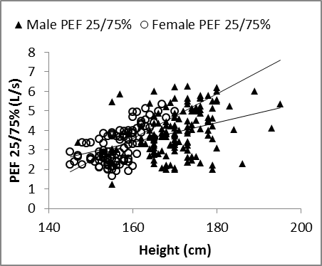 | Figure 8. Nasal FEF25/75%vs. height in males and females |