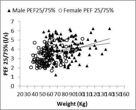 | Figure 9. Nasal FEF25/75% vs. weight in males and females |