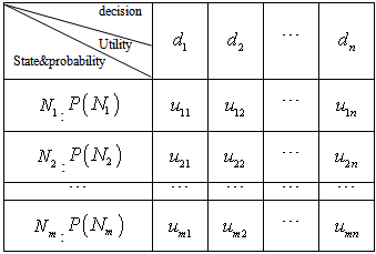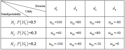 , which d1 stands for high investment, d2 stands for medium investment, d3 stands for low investment, and d4 stands for no investment. The utility of four options under different states is in Table 2. Data description: the expected utility declines along with the diminishing prospect of market state. For example:
