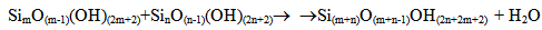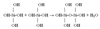 Under the temperature 200℃ solubility Ce is 940.8 mg/kg, under the temperature 150℃ – 651.8 mg/kg, 100℃ – 405.3 mg/kg, 25℃– 130.8 mg/kg.Such condition of monomeric silicic acid in water solution is unstable. Solution supersaturation Sm which is equal to the difference (Cs-Ce) of orthosilicic acid concentration Cs and solubility Ce causes nucleation and polymerization of silicic acid molecules with condensation of silanol groups and formation of siloxane links and partial dehydration in accordance with the following reactions (Iler R., 1982): | (3) |