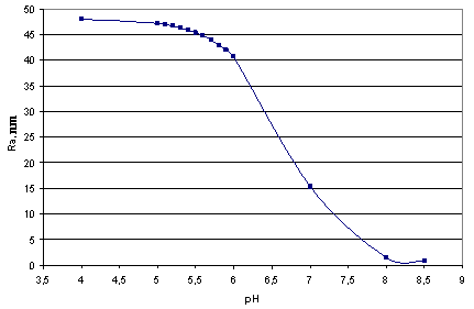 | | рН | RA, nm | рН | RA, nm | | 5 | 47.305 | 5.5 | 45.423 | | 5.1 | 46.995 | 5.6 | 44.854 | | 5.2 | 46.771 | 5.7 | 44.007 | | 5.3 | 46.42 | 5.8 | 43.077 | | 5.4 | 45.954 | 5.9 | 42.028 |