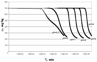 On Figure 2 the dependence of concentration of dissolved silicic acid CS (mg/kg) on time Tp (min) is shown for t=50℃, initial concentration CS=700 mg/kg and different values рН; Figure 3 presents the dependence of supersaturation SN on time Tp (min); Figure 4 (а-f) presents the dependence of distribution of final sizes of silica particles. | Figure 2. The dependence of concentration of dissolved silicic acid on time. t=50℃, initial concentration CS=700 mg/kg |