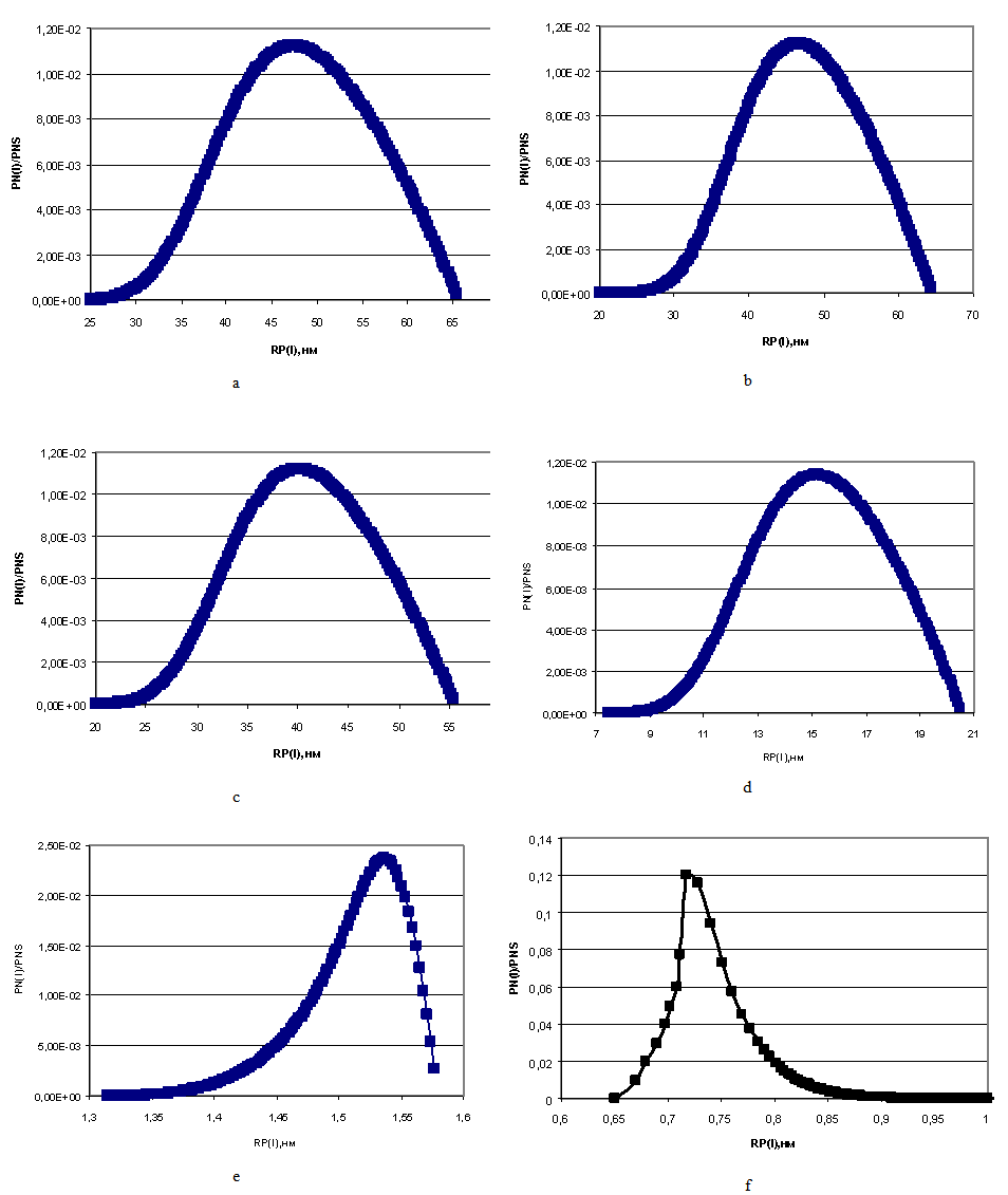 | Figure 4. The distribution of particles sizes under the temperature t=50℃, initial concentration CS=700 mg/kg. a – рН=4; b – рН=5; c – рН=6; d – рН=7; e – рН=8; f – рН=8.5 |