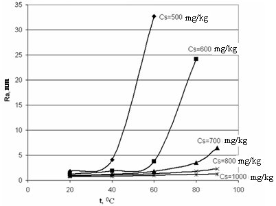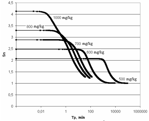 | | CS,mg/kg | t, ℃ | | 20 | 40 | 50 | 60 | | 300 | 93.57 | - | - | - | | 350 | 12.46 | 1019.9 | - | - | | 400 | 4.35 | 49.11 | 586.3 | - | | 500 | 1.79 | 4.088 | 8.968 | 32.71 | | 600 | 1.246 | 1.846 | - | 3.808 | | 700 | 0.988 | 1.219 | - | 1.775 | | 800 | 0.876 | 1.054 | - | 1.311 | | 1000 | 0.739 | 0.836 | - | 0.952 | | CS,mg/kg | t, ℃ | | 70 | 80 | 85 | 90 | | 300 | - | - | - | - | | 350 | - | - | - | - | | 400 | - | - | - | - | | 500 | - | - | - | - | | 600 | 7.56 | 24.14 | 56.14 | 169.8 | | 700 | - | 3.488 | - | 6.496 | | 800 | - | 1.815 | - | 2.308 | | 1000 | - | 1.108 | - | 1.212 |