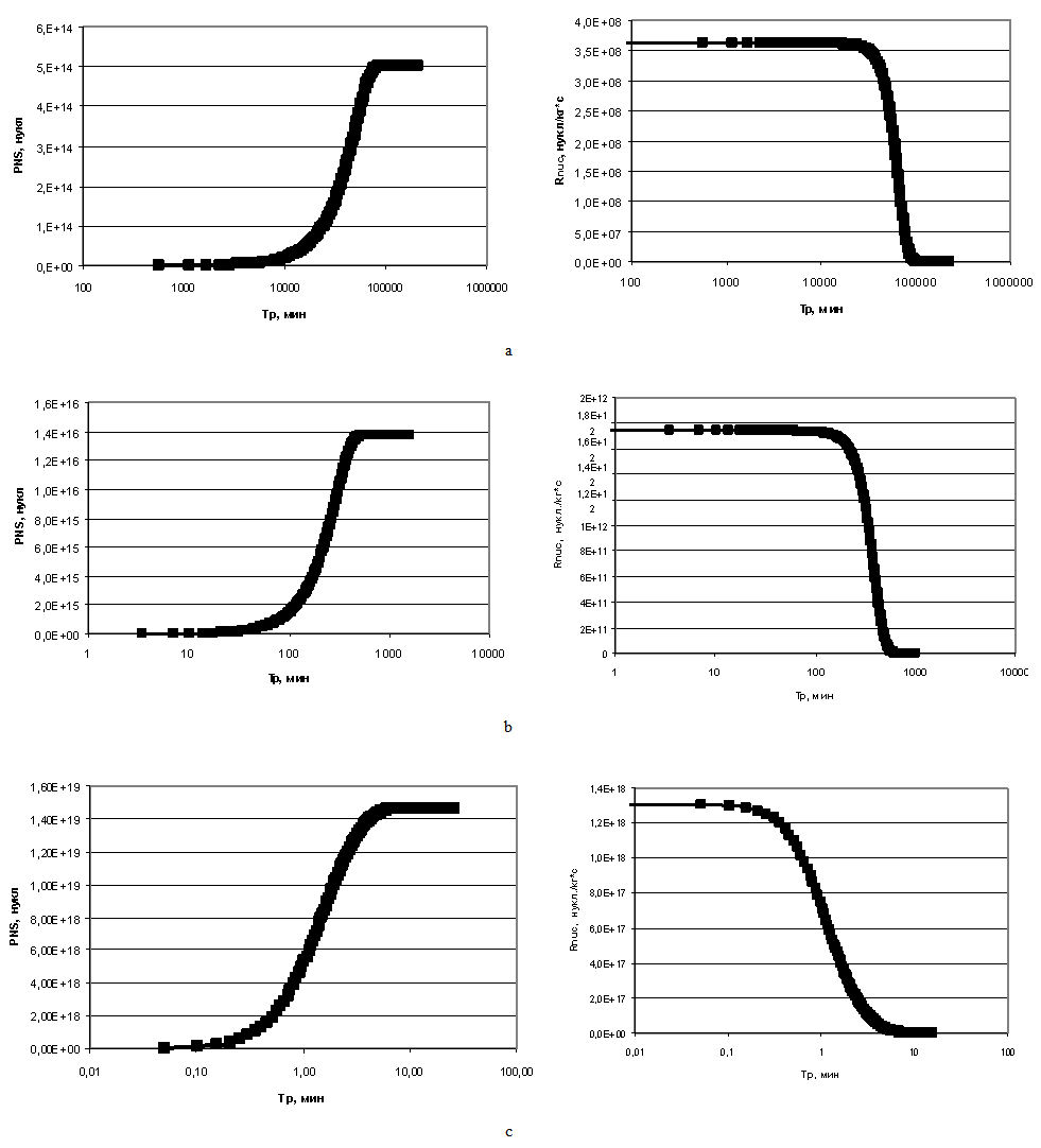 Figure 2 shows that curves reflecting the dependence of concentration of dissolved silicic acid on time have two areas: convex curve reflects homogeneous nucleation, that is the stage of formation of new particles centres, concave part reflects heterogeneous nucleation, i.e. the growth of centres formed earlier.Figure 6 (a–c) presents the dependence of quantity of the formed particles PNS (nucl) on time TP (min) and dependence of nucleation rate Rnuc (nucl/kg*s) on time ТР (min) under the temperature t=50℃, initial concentration CS=700 mg/kg and different рН.  | Figurer 6. Dependences of formed particles quantity PNS on time ТР and dependences nucleation rate Rnuc on time ТР; t=50℃, initial concentration CS=700 mg/kg. а – рН=5; b – рН=7; c – рН=8 |