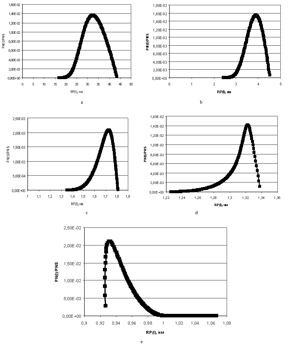 | Figure 9. The distribution of particles sizes at the temperature t=60℃, рН=8. а – CS=500 mg/kg; b – CS=600 mg/kg; c – CS=700 mg/kg; d – CS=800 mg/kg; e – CS=1000 mg/kg |