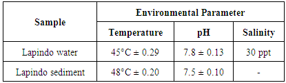Table 1 indicates that the temperature of the mud water and solid sediment of Lapindo is high temperatures due to the Lapindo mudflow originating from the earth. This is in accordance with Koesoemadinata [8] mentioned that many experts stated Lapindo mudflow as an analogy of natural phenomena called mountain/volcano mud that is widely spread in Indonesia. Mud volcano is a volcano of cone-shaped mud clay and small mud volcanoes, generally less than 1-2 m in height. Small mud volcanoes are formed from a mixture of hot water and fine sediments (clay and silt) where there is (1) a slow flow from a hole like a stream of molten lava; or (2) sprayed into the air like a fountain of lava that releases boiling water and volcanic gases.Table 1. Environmental Conditions of Lapindo Mud  |