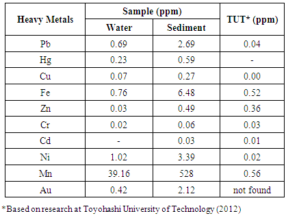 At salinity test, Lapindo water reaches 30 ppt or 30,000 ppm, thus Lapindo water categorized in brackish water with high salinity. That is because the material coming out of the Lapindo mudflow is derived from a mixture of water that has a high salinity levels (seawater). This is supported by Satrio et al. [9], the contribution of ground water or sea water to water that comes out of the middle Lapindo mudflow. However, the salinity in the Lapindo solid sediment sample is not detected due to the solid sample.The pH of the water and sediment samples of Lapindo mud can be categorized base because it has a pH greater than 7. It is associated with high levels of salinity. This is in accordance with Brotowidjoyo et al. [10] stated that the pH of sea water generally ranges between 7.6 - 8.3, and added by Rindayani [11] that the pH has been adjusted to a pH of brackish water that ranges from 6.5 to 8.Table 2 indicates that the levels of heavy metals contained in the water and sediment Lapindo mud is different. This is evidenced by the test concentration of heavy metals using AAS and spectrophotometer using a 10 heavy metal test because the metals are commonly found in the environment.Table 2. Levels of Heavy Metal in the Environment of Lapindo Mudflow in Sidoarjo  |