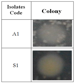 In Table 3, morphology of colony isolates A1 shows a rounded shape, white thin and flat edges with a flat cell elevation. While the colony morphology of bacterial isolates S1 has a smoothly rounded shape, elevation of cells arises, white to soft yellow colour; in which the yellow colour is inside and white colours is found in the outer layer of bacteria; thus the bacterial cell edge layered looks flat because there are two layers of colour.Table 3. Colony Morphology of Bacteria  |