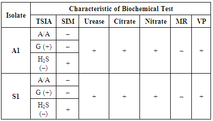 From the A1 isolate, the obtained results include: lysine test (+), ornithine test (+), H2S test (-), glucose test (+), mannitol test (+), xylose test (+), ONPG test (+), test indole (-), urea test (+), VP test (+), citrate test (+), and TDA test (-).From S1 isolates, the obtained results are: test lysine (-), ornithine test (-), H2S test (-), glucose test (+), mannitol test (+), xylose test (+), ONPG test (-), test indole (-), urea test (-), VP test (-), test citrate (-), and TDA test (-).