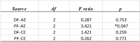 Independent t-tests were used to analyze group difference scores in both absolute error (AE) and constant error (CE). This analysis revealed no significant differences of AE in dorsiflexion between the control and concentric groups, the control and eccentric groups, and the eccentric and concentric groups. The repeated measures ANOVA was used to compare RJPS mean error score differences between each of the three groups. The ANOVA revealed a significant difference in AE in plantarflexion in the ECC (M= -1.02° ± 2.43°) versus control (M= 1.31° ± 2.28°) at 95% confidence Interval (CI) group analysis (p=0.04) with a raw effect size nearing 0.3°. No differences were found between the CONC and control or the ECC and CONC scores in plantarflexion (Figure 1). (Table 1).Table 1. Repeated Measures ANOVA comparing RJPS errors, Absolute (AE) and Constant Error (CE) between groups in two ranges of ankle motion. DF=Dorsiflexion, PF=Plantarflexion, (F-critical across comparisons=3.354)  |