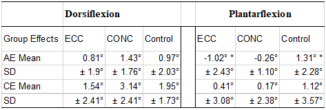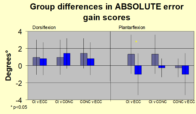 The preceding CE results fail to support H2, which states that constant error of JPS reproduction will be significantly higher in the exercised subjects when compared to the control group. The results also refute H4, which states that constant error of JPS reproduction will be significantly higher in the eccentric group when compared to the concentric group (Table 2).In summary, pre-exercise and post exercise error scores were recorded for the experimental groups in both dorsiflexion and plantarflexion and the difference scores (gain scores) were used for data analysis. Pre-test and post-test error scores were recorded for the control group in both dorsiflexion and plantarflexion and the gain scores were used for data analysis. Group gain scores were compared between groups to determine treatment effect on ankle RJPS. Neither the concentric exercise group nor the eccentric exercise group was found to have higher AE scores than the control group in dorsiflexion. In plantarflexion, the concentric group versus control group showed no significant differences. The eccentric group demonstrated a significant difference in AE scores when compared to the control group, but with means of –1.02° and 1.31° respectively, the eccentric group displayed an improvement in RJPS while the control group worsened. These results refute H1, which states that RJPS AE scores will be significantly higher in the exercised subjects than in the control group. The results also refute H2, which states that RJPS CE will be significantly higher in the exercised subjects than in the control group. Neither the CONC group nor the ECC group was found to differ from the control group in CE scores in dorsiflexion or plantarflexion measurements.When the AE mean difference scores of the CONC group were compared to the ECC group, no significant differences were found. This result contradicts H3, which asserts that RJPS AE scores will be significantly higher in the eccentric subject group than the concentric subject group. Additionally, no differences were found in the CE scores between the concentric exercise group and the eccentric exercise group. H4, which asserts that CE will be significantly higher for the eccentric group than for the concentric group, is refuted by the study’s results.
