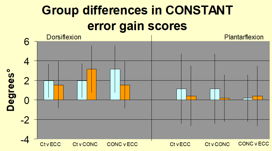 | Figure 2. Group comparison of constant error gain scores across the three groups of Control (Ct), Eccentric (ECC) & Concentric (CONC) in both the ankle dorsi and plantarflexion ranges. No significant difference was observed at the CI of 95% |