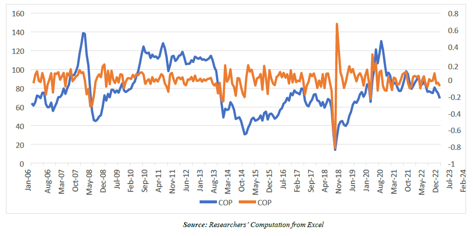 This transformation helps in capturing proportional changes and is suitable for volatility modeling. | Figure 2.1. Time Series Plots of COP and COPR |