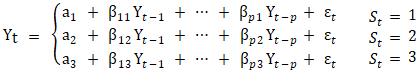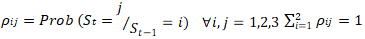 Where the regimes in are indexed by 𝑆𝑡. In MS-AR model, the intercept and the parameters of the AR part are reliant on 𝑆𝑡 at time t. The 𝑆𝑡 is presumed to be distinct unobservable variables. Hence, this research labels 𝑆1 (regime 1) as the eras of low volatility of the crude oil pricess’ returns (𝑟𝑡), 𝑆2 (regime 2) symbolizes eras of moderate volatility of the returns (𝑟𝑡) and 𝑆3 (regime 3) symbolizes a high volatility of the returns (𝑟𝑡). The transitions of the 𝑆𝑡 (regimes), are presumed to be ergodic and intricate 1st order Markov-process. This means impacts of earlier observation(s) for the 𝑟𝑡 and regime(s) is/are completely captured in the recent 𝑟𝑡 regime(s) observations as represented in (3.3); | (2.3) |