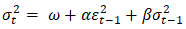 where:𝜔 > 0 is the long-term variance constant,𝛼 ≥ 0 measures the short-run persistence of shocks (ARCH effect), and𝛽 ≥ 0 captures the long-run persistence or the contribution of past volatility (GARCH effect).