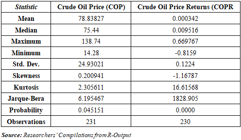 Descriptive statistics of the log returns are presented below. The mean return is slightly negative, and the standard deviation indicates moderate volatility. The presence of extreme values suggests potential for regime shifts. The Jarque–Bera test [19] confirms significant departures from normality in the distribution of returns, indicating heavy tails and excess kurtosis.Table 3.1. Descriptive Statistics of Crude Oil Prices and its Returns  |