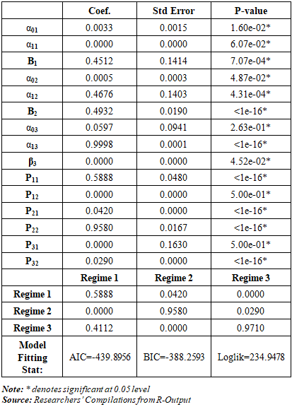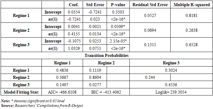The MS-AR(1) model identifies three distinct regimes: low, medium, and high volatility. Each regime is characterized by its own mean return, autoregressive coefficient, and variance.Table 3.2. Summary of Estimations of MS-AR(1) Model  |