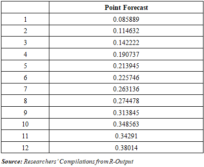 Forecasts of regime probabilities and volatility for the first quarter of 2025 suggest a high likelihood of entering a high-volatility regime. This has significant implications for fiscal planning and risk management in Nigeria’s oil sector.Table 3.6. Point Forecast of Crude Oil Prices Returns using MS-AR(1)  |