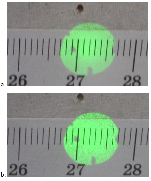 A slight shift of the laser beam toward the «red zone» of the visible spectrum was observed after the initial 15 minutes of friction (e.g. Figure 2). The amount of long-wave shifting becomes stable during the first hour of friction and remains unchanged to the end of testing. After the friction was stopped, the laser spot returned to the starting point.The computer estimation of the position of the light spot boundaries on the screen enabled to measure the amount of long-wave shift to the laser spot initiated by friction forces which was about 0.1-0.2 nm. | Figure 2. A shift in laser spot edge on the condenser screen scale: a – before testing; b – after 4.5 h-testing |